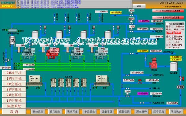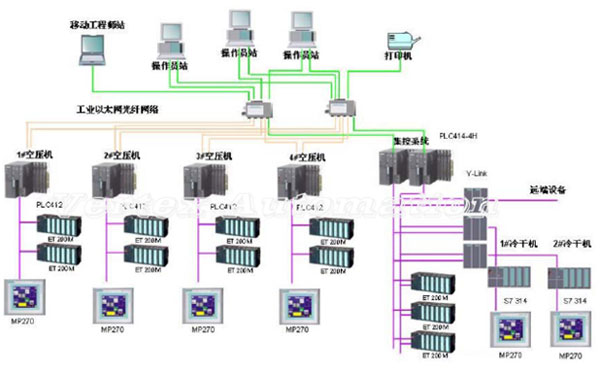 4台空压机采用西门子PLC412系统控制,辅以现场触摸屏作为就地控制;外围设备包括去各工艺管路的温度、压力、流量参数,去各工艺管路供气阀门,五套余热再生式干燥器,采用一套PLC414H系统集中控制;两台冷干机采用S7-314控制器控制,并且通过Y-link并入414H集控系统。